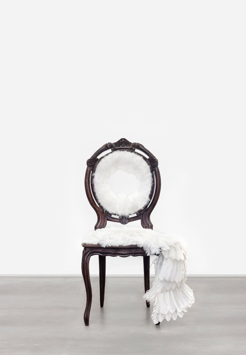 Published 19/10/2025 at 2430 × 3510 cadeira IV, 2025 cadeira IV, 2025 penas e madeira de mobiliário 104x66x66cm foto Filipe Berndt