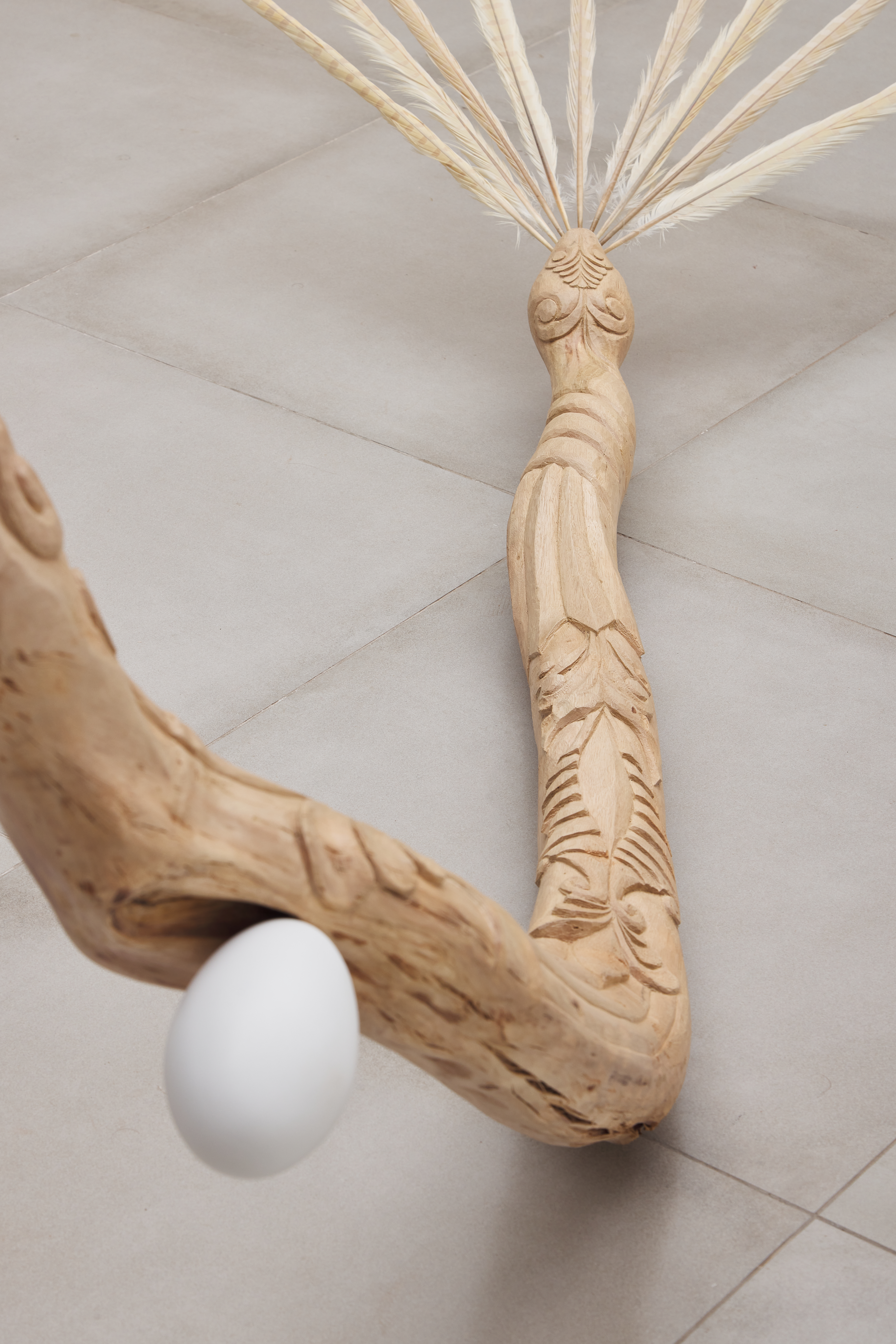 Publicado 16/04/2024 em 5299 × 7944 em início ← Anterior Seguinte → caninana, 2023 (detalhe) caninana, 2023 (detalhe) escultura em madeira (eucalipto) e penas 80x50x290cm foto: Rafael Salim Gosto Carregando...