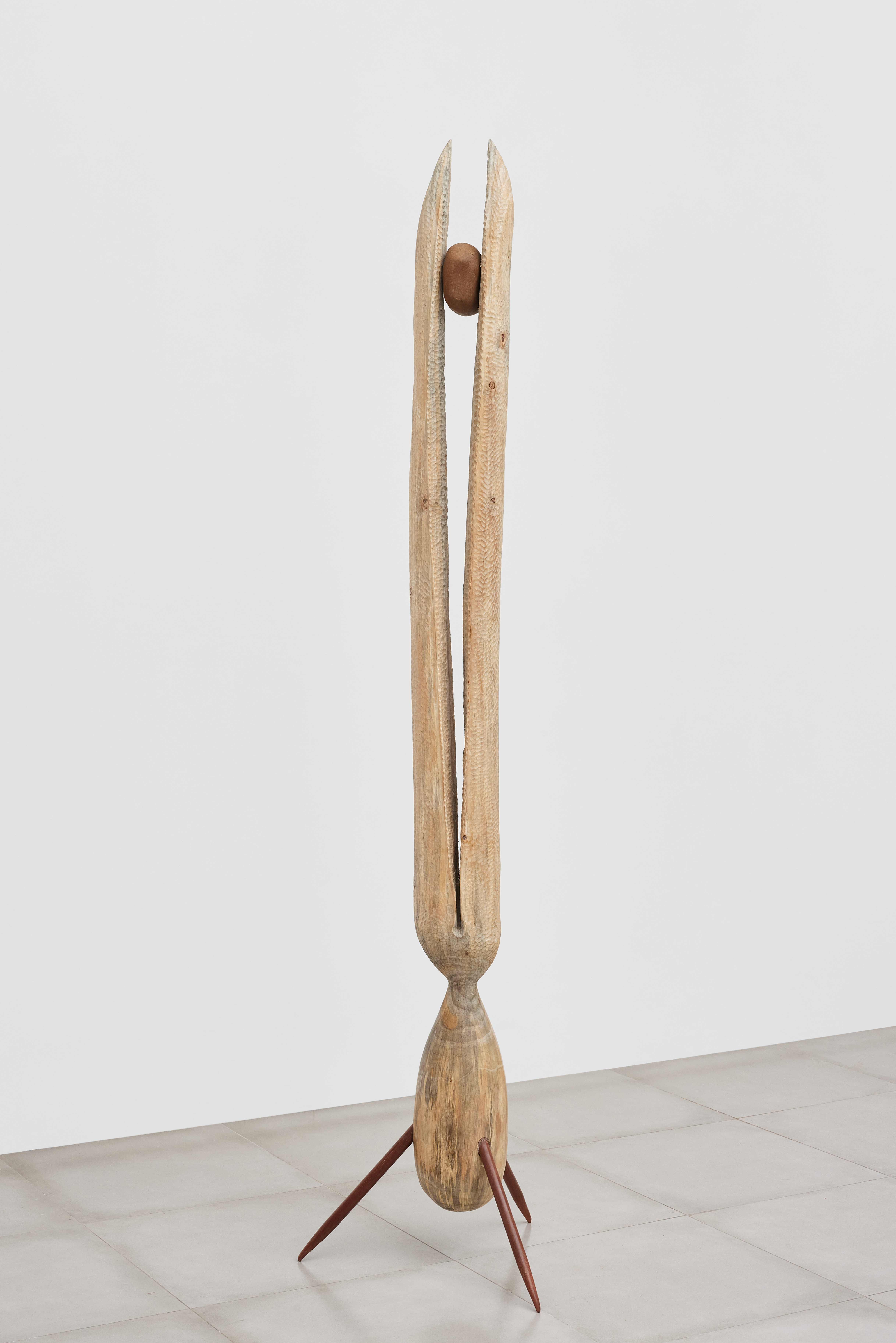 Published 25/03/2023 at 4870 × 7301 passarinho que come pedra, 2023 passarinho que come pedra, 2023 madeira (eucalipto) e pedra 215x50x50cm foto: Rafael Salim