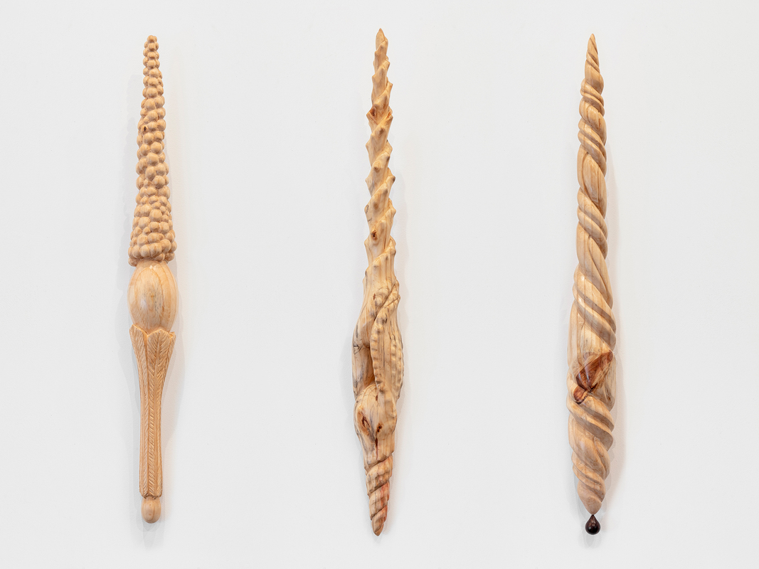 Published 19/12/2022 at 1067 × 800 série lança (nº 1), 2022 série lança (nº 1), 2022 trípitico em pinus e coco de iri 100x11cm (cada lança) foto: Filipe Berndt